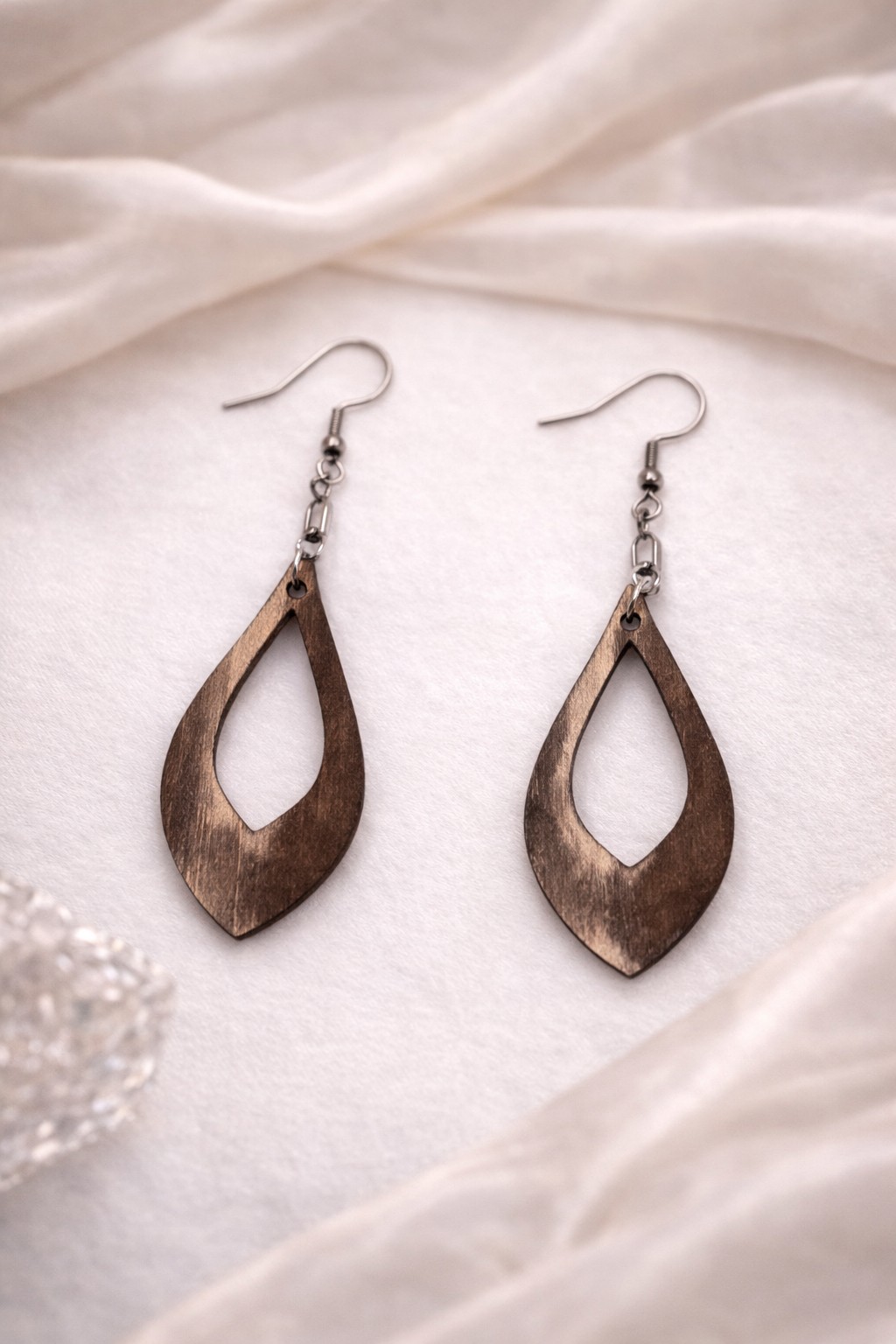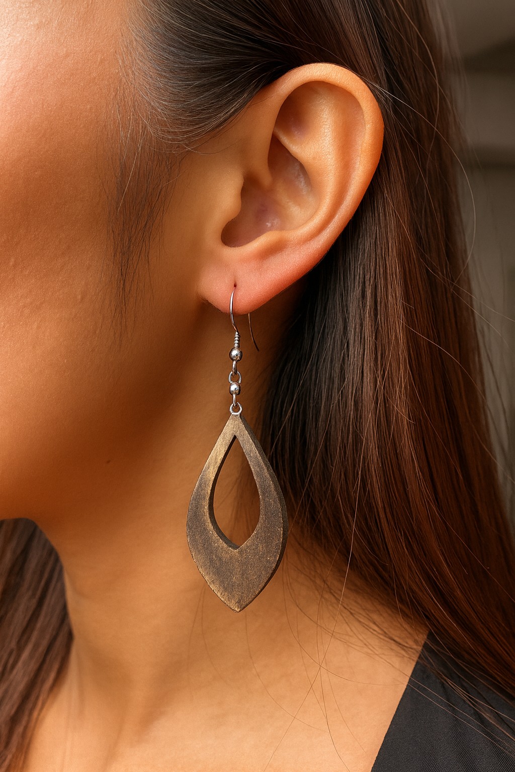 Façonnées  dans un bois aux nuances chaleureuses, ces boucles d’oreilles au charme vintage séduisent par leur silhouette ajourée et intemporelle. Leur finition légèrement patinée évoque l’authenticité des bijoux d’antan, revisitée avec une élégance contemporaine.